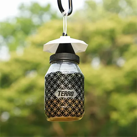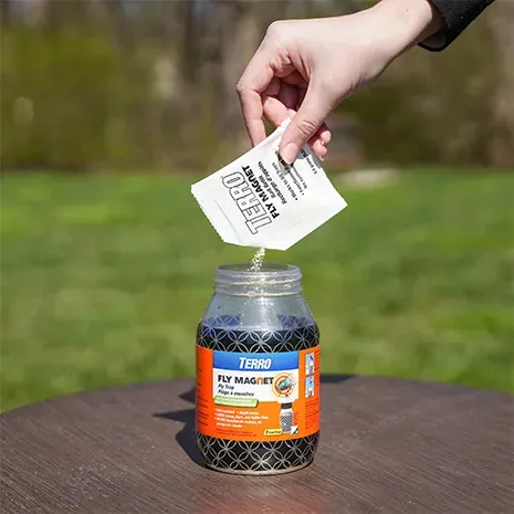 TERRO® Fly Magnet® ハエトラップは、使い方も非常に簡単です。ベイトパックの中身をトラップに入れ、温水を注水線まで注ぎ、軽くかき混ぜるだけです。トラップは地面に設置するか、木の枝、杭、その他の適切な吊り具に吊るしてください。トラップは屋外での使用を想定して設計されているため、ハエが家の中に侵入する前に、トラップを外に引き寄せることができます。最適な効果を得るには、暖かく、明るく、静かな場所にトラップを吊るしてください。
